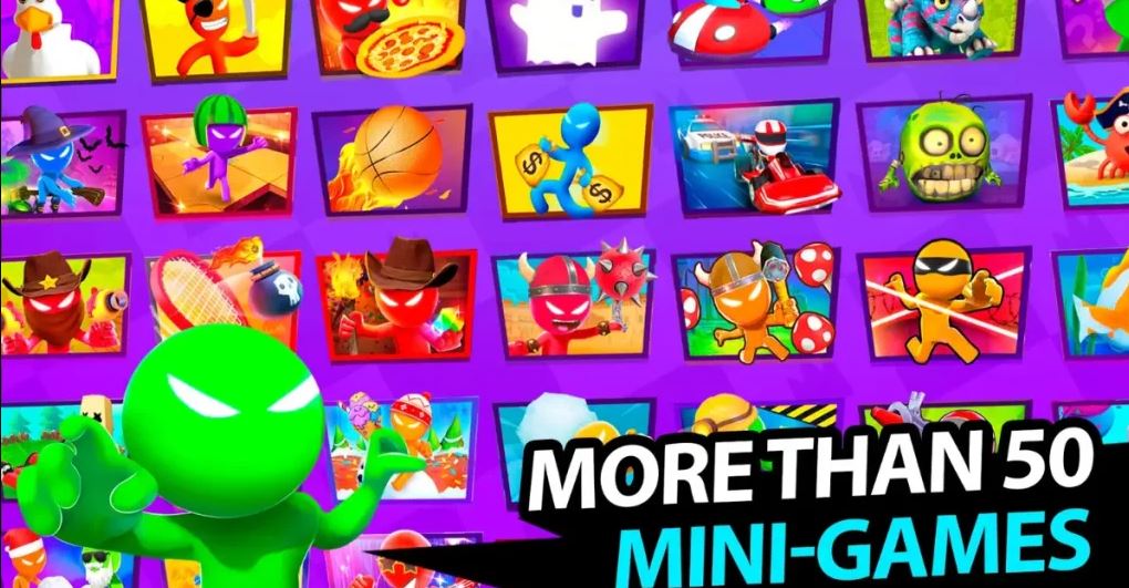 The game combines action, sports, puzzle, and racing mini-games into short, fun challenges, including tank battles, football matches, and color fights, all in stickman style.